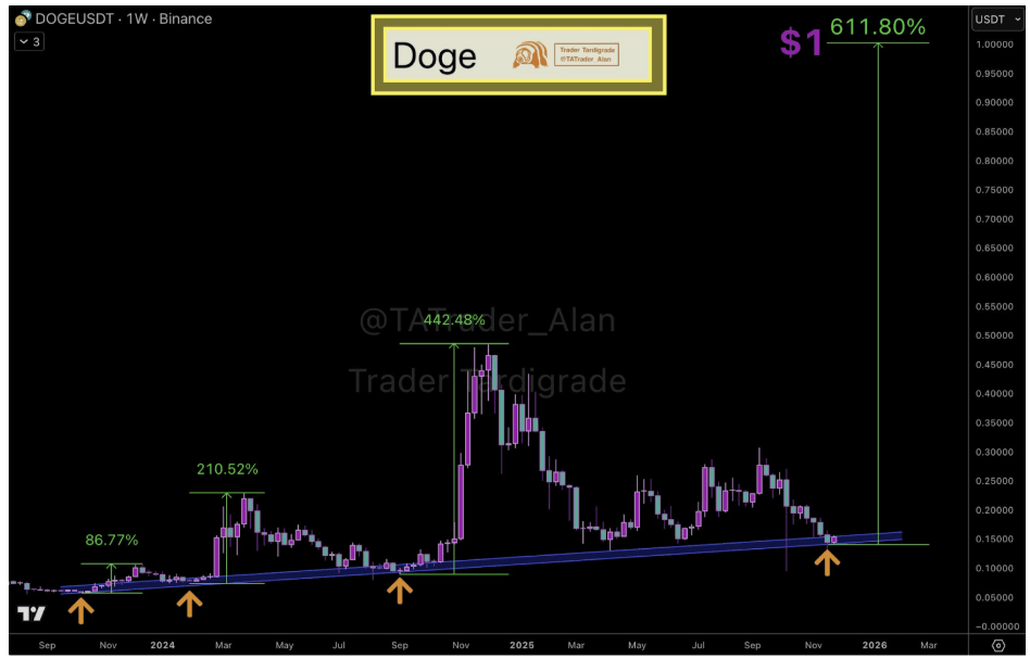 分析师表示,这一模式依然成立,如果0.15美元的支撑位能够守住,狗狗币可能会延续之前的走势,进入更大的扩张阶段。根据他的预测,这种延续将为狗狗币提供足够的动力,使其在2026年之前逐步上涨610%,达到1美元。