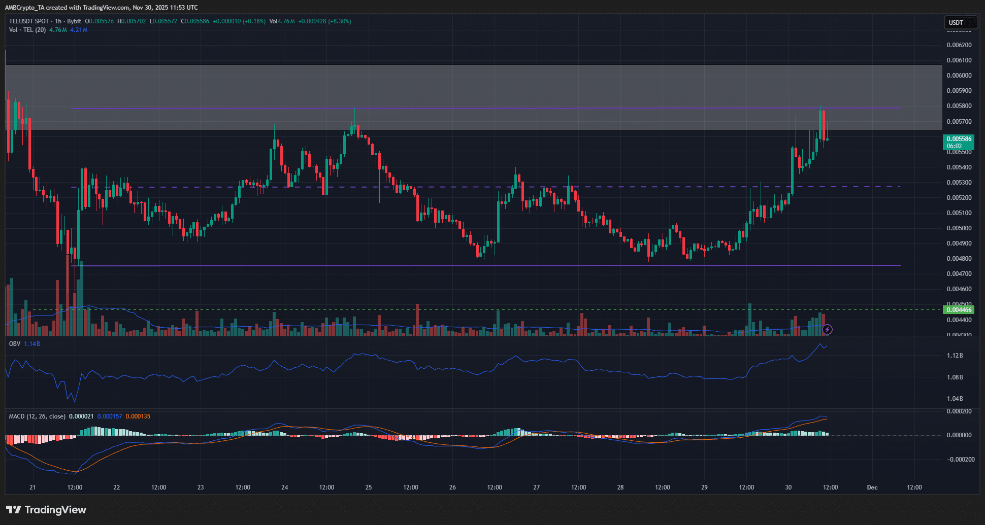 因此,TEL 不值得买入,而是低时间周期交易者应该获利了结的代币。