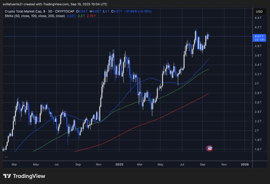 短期来看,市场已测试了 4.06 万亿美元的阻力位,虽略有回落,但仍维持在建设性的盘整区间内。这种走势表明,尽管近期的上涨势头有所放缓,但买方仍然牢牢掌控着市场。若能果断突破 4.1 万亿美元,则有望开启新高,并预示着牛市下一轮的扩张。