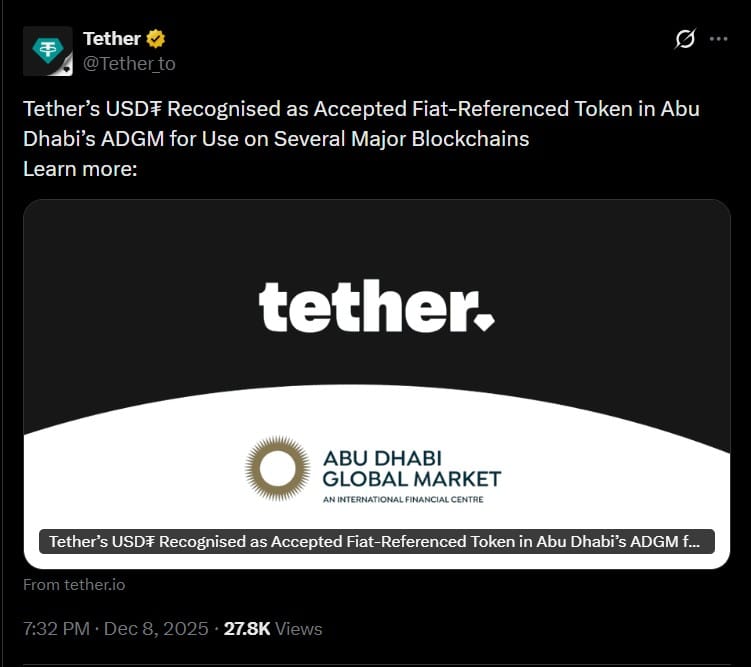 Tether 在阿布扎比全球市场 (ADGM) 也取得了重大胜利,USDT 现在已被正式认可为多个区块链(包括 Aptos、Cosmos、Near、Polkadot 和 TON)接受的法币参考代币。