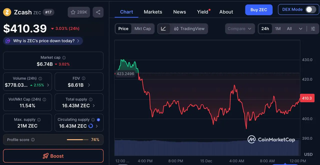 Zcash($ZEC)在过去24小时内下跌2.98%,交易价格约为410美元。这一价格走势与整体市场波动以及围绕隐私型加密货币的讨论重燃相符,因为监管机构仍在评估合规框架。短期来看,Zcash可能面临风险。挥发性