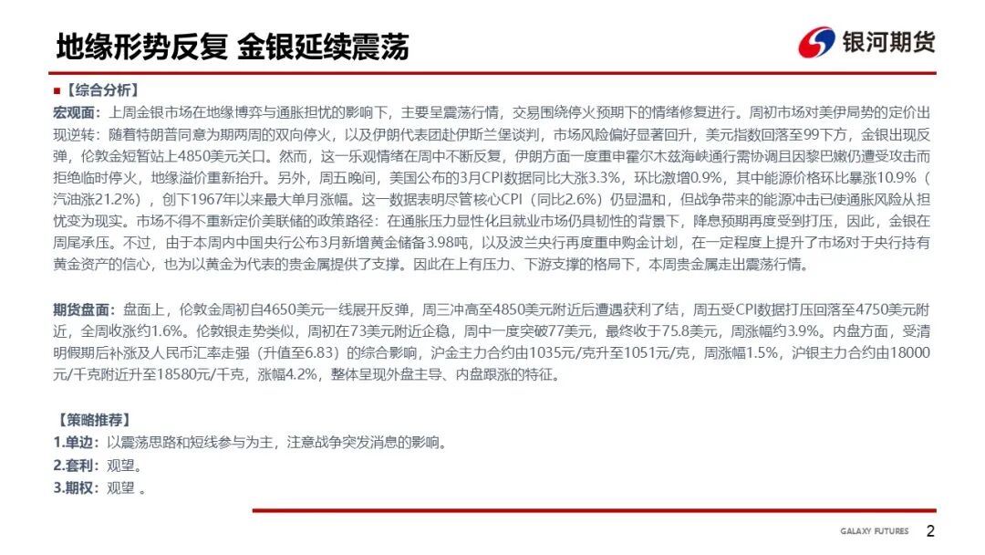 【贵金属周报】金银:地缘形势反复金银延续震荡;铂钯:停火预期叠加CPI降温铂钯周度反弹