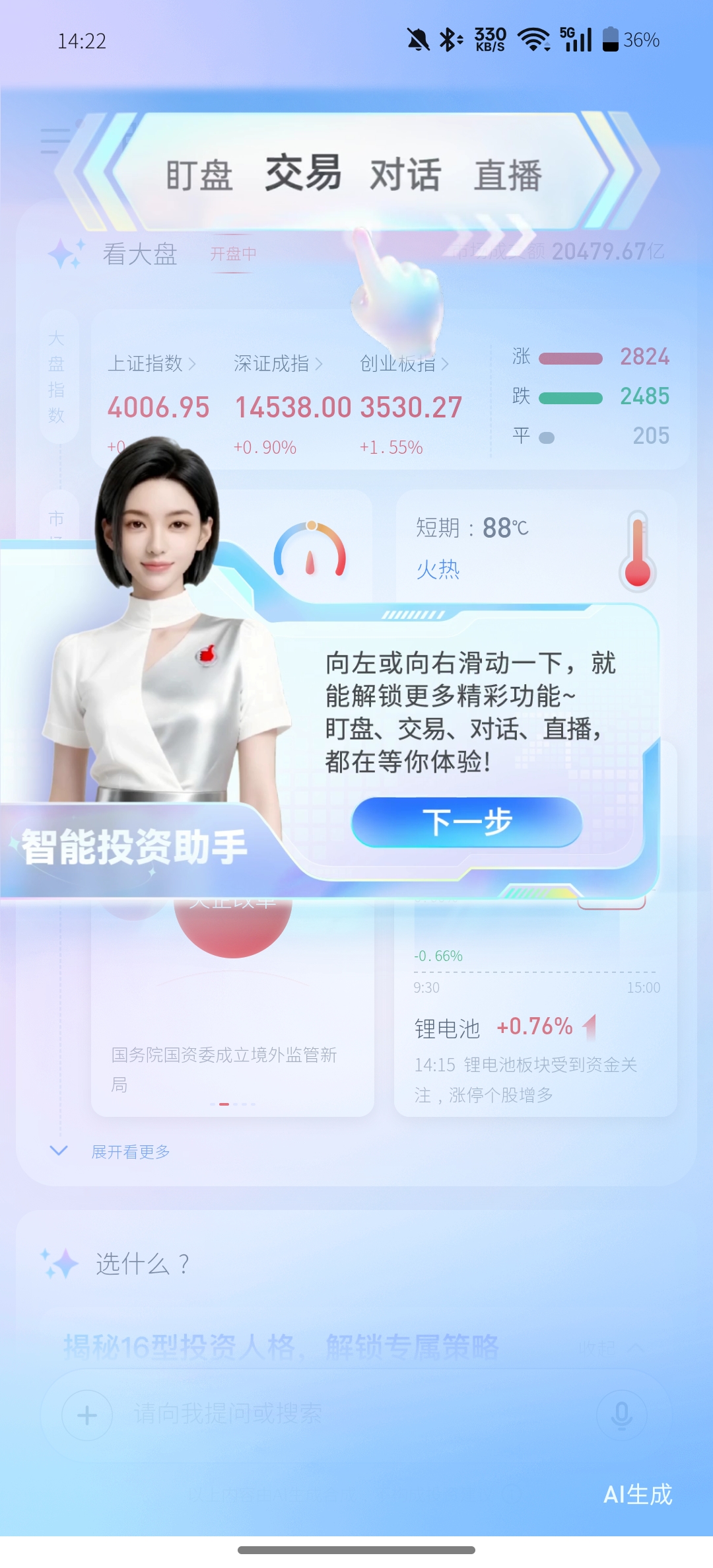刚打开灵犀APP 2.0的朋友,首先会看到引导界面,左右滑动就能解锁「盯盘、交易、对话、直播」四大一体化功能区,还有专属智能投资助手全程陪伴,完全不用怕找不到北,咱们一步步往下说。