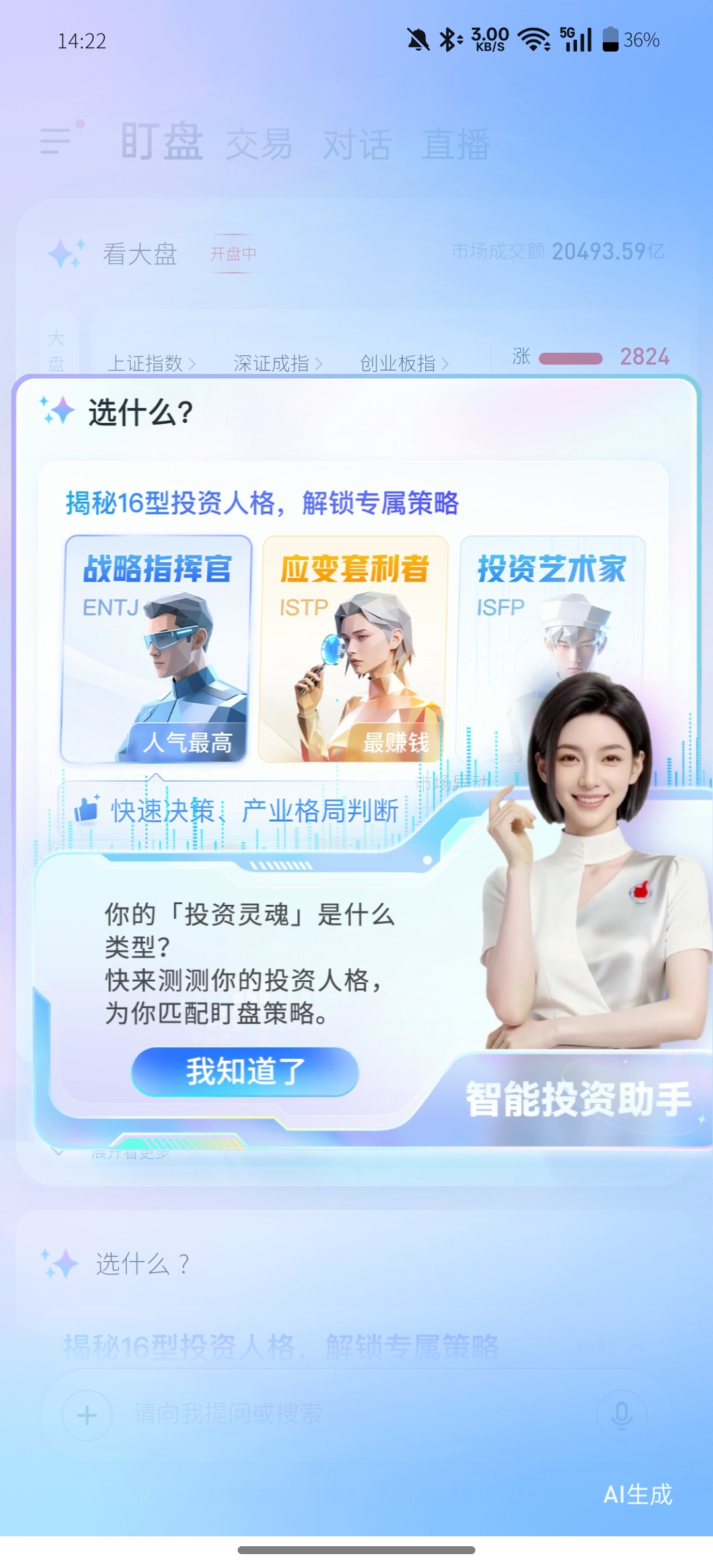 更贴心的是,APP全新上线了6款不同人设的智能投资助手,支持真人、3D科技、二次元多种风格,7×24小时在线提供陪伴式服务。对话界面还集成了智能选股、盯盘提醒、智能诊断等场景化服务,深度融合海量金融数据库和实时行情,哪怕是新手,也能通过对话轻松搞定专业投资操作,真正实现“言出即达”。