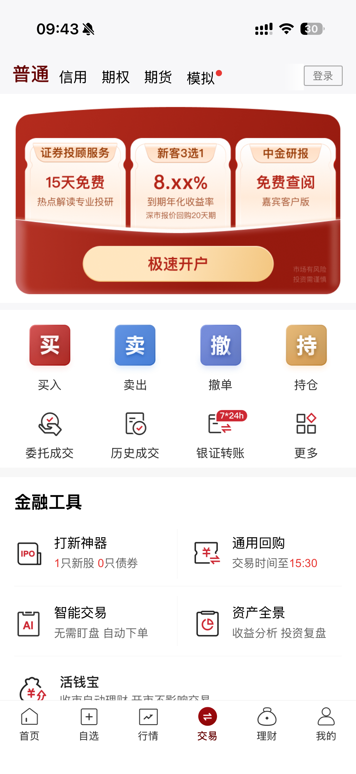打开中金财富 APP,登录你的证券账户,点击底部导航栏【交易】