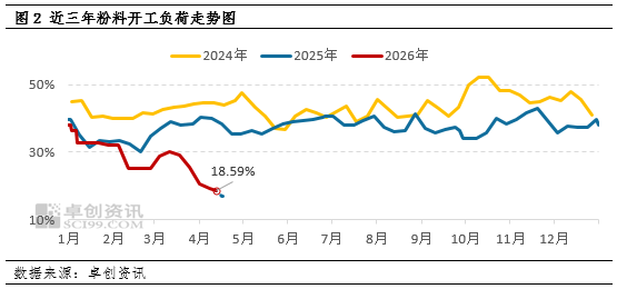 地缘局势波动下,成本端是决定粉料价格走势的核心因素,丙烯作为粉料生产的核心原料,其价格波动直接主导企业生产成本与定价策略。从丙烯供应端来看,主营企业及PDH开工负荷下滑,进入4月PDH开工负荷降至近两年新低。且受中东冲突影响,企业不可抗力增多,丙烯进口量同步缩减。供应端的收缩对丙烯价格带来较强支撑,截至4月14日,山东丙烯均价在9415元/吨,比去年同期高2765元/吨。高位的原料成本使得粉料生产企业理论毛利持续处于亏损区间,截至4月14日,粉企外采丙烯的利润毛利再度走弱,负值扩大至-593元/吨,较月初下滑379.5元/吨。粉料企业亏损程度加深,让利意愿极低,大幅降价出货的可能性基本不存在,为粉料价格构筑了坚实的成本防线。