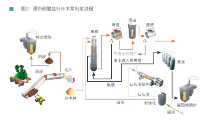 以漂针浆为例,纸浆的工业制造流程主要包括原料采贮和削片、蒸煮、洗 涤、筛选、漂白、烘干、切片和打包等工序。在具体制造流程中,首先取全树长 原木,将其剥皮并削成较小木片,经筛选的合格木片用氢氧化钠(NaOH)和硫 化钠(Na2S)溶液蒸煮1至2小时。蒸煮液视有效化学成分浓度,可能补充部分经回 收的蒸煮液以提高效率。蒸煮过程将除去木质素,使木材分解成纤维素纤维。蒸 煮后的粗浆经洗浆机洗涤后,用筛浆机除去过大的碎片得到细浆。细浆经多段漂 白和浓缩后,制成湿浆板并送入干燥机干燥。最后经切片和打包后,所得纸浆即 可以浆包形式交货。具体制浆流程示意图如图2所示。