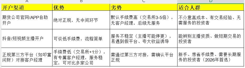 新手必须选有专属一对一客户经理的渠道,能协助调手续费、调低保证金、解答交易规则、协助开通期权/股指期货等特殊权限。避免选“无客户经理”的官网自助开户,后续调费、问问题全靠自己打客服电话,效率极低。