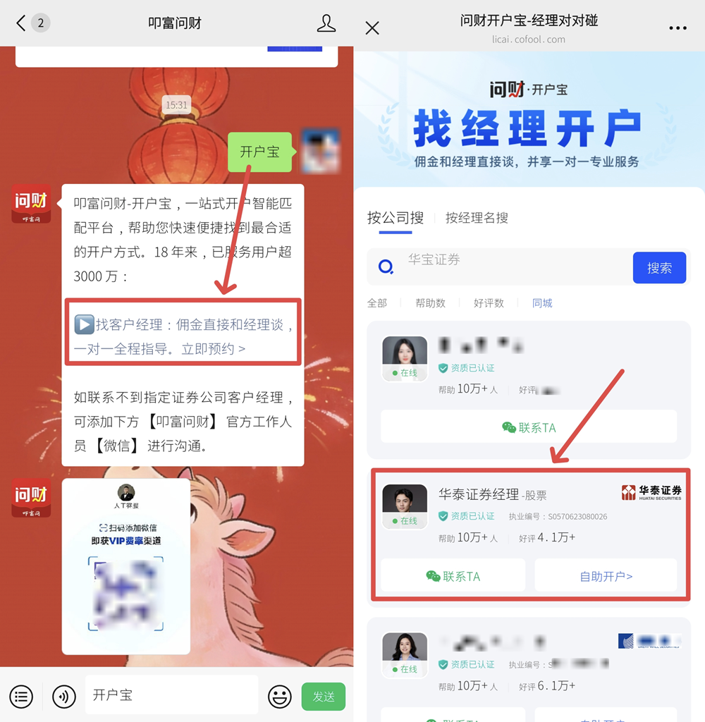 微信搜索并关注服务号【叩富问财】,在对话框回复“开户宝”,就能对接华泰证券专属客户经理获取低佣开户链接。后续遇到佣金调整、账户操作、交易规则等问题,都能直接联系客户经理一对一咨询,比单纯通过官方客服咨询更高效更省心。