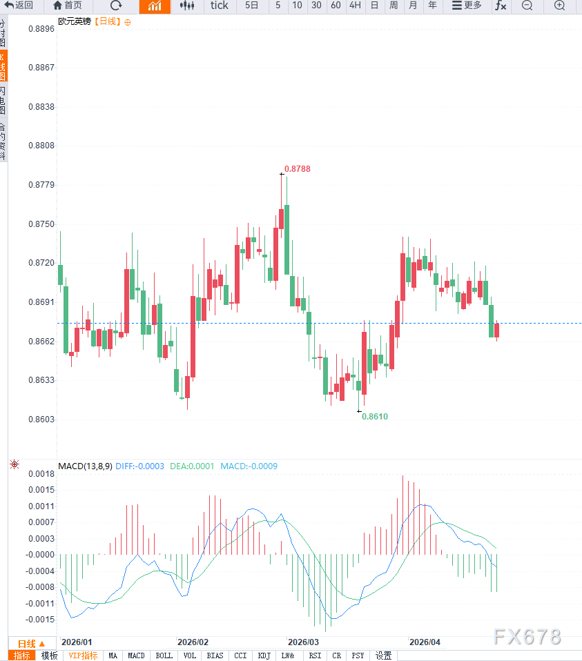 从技术面来看,日线级别EUR/GBP处于震荡整理结构中,整体趋势偏中性。当前上方0.8700附近构成关键阻力区域,若突破则可能进一步测试0.8750;下方0.8640为短期支撑,一旦跌破,可能回落至0.8600区域。动能指标显示市场缺乏趋势性驱动,处于整理阶段。4小时周期上,汇价呈现温和反弹结构,但动能有限,短期均线走平,MACD动能温和,显示上涨缺乏持续性。若无法有效突破0.8700,汇价或重新回归区间震荡。