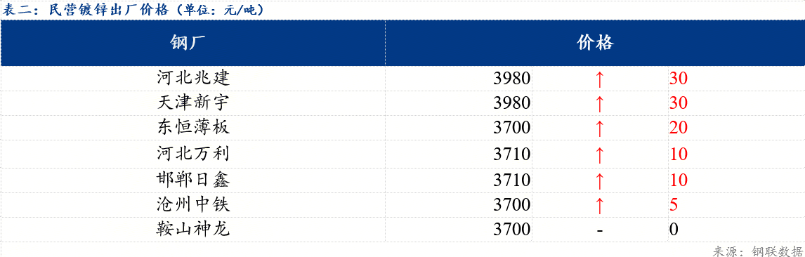 今日北方民营钢厂镀锌出厂指导价在3700-3980元/吨。