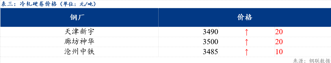 北方市场冷轧基料3.0*1010*CSPHC河北普阳价格为3280元/吨,较上一期价格上涨10元/吨,河北纵横价格为3290元/吨,较上一期价格持稳。镀锌方面,今日北方钢厂指导价格稳中上调5-30元/吨;轧硬方面,当前主流报价3485-3500元/吨。市场方面来看,热卷期货盘面震荡偏强,现货市场价格多跟涨为主,成交较上一交易日有所减量,市场需求一般,商家对后市行情持谨慎态度。