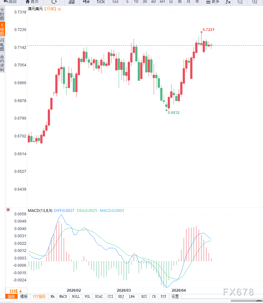 从技术面来看,日线级别AUD/USD维持震荡整理结构,整体趋势偏中性。当前上方0.7200附近构成关键阻力区域,若突破将打开进一步上行空间至0.7250;下方0.7100为重要支撑,一旦跌破可能回落至0.7050区域。动能指标显示市场缺乏趋势性驱动,价格在区间内反复波动。4小时周期上,汇价呈现横盘整理结构,短期均线走平,MACD动能有限,显示短线方向不明确。若无法突破0.7180,汇价或继续维持震荡偏弱格局。