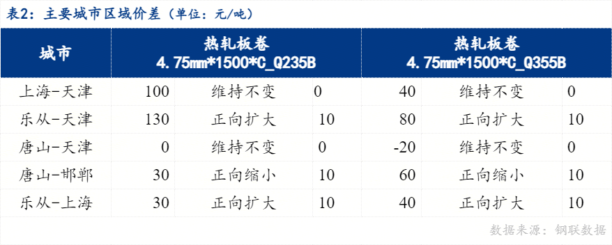 从区域价差来看,4.75mm普卷华南与华北价差130元/吨,华东与华北价差100元/吨,华南与华东价差30元/吨。京津冀地区价差来看,唐山与天津价差0元/吨,唐山与邯郸价差30元/吨。