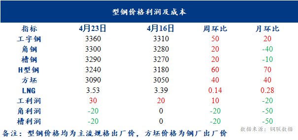 唐山型钢价格趋强运行,型材价格周度对比工字钢、角钢、槽钢、H型钢价格较上周上涨20-50元/吨,钢坯价格较上周价格上涨40元/吨,LNG价格较上周趋强,调坯轧钢厂理论利润持续压缩。