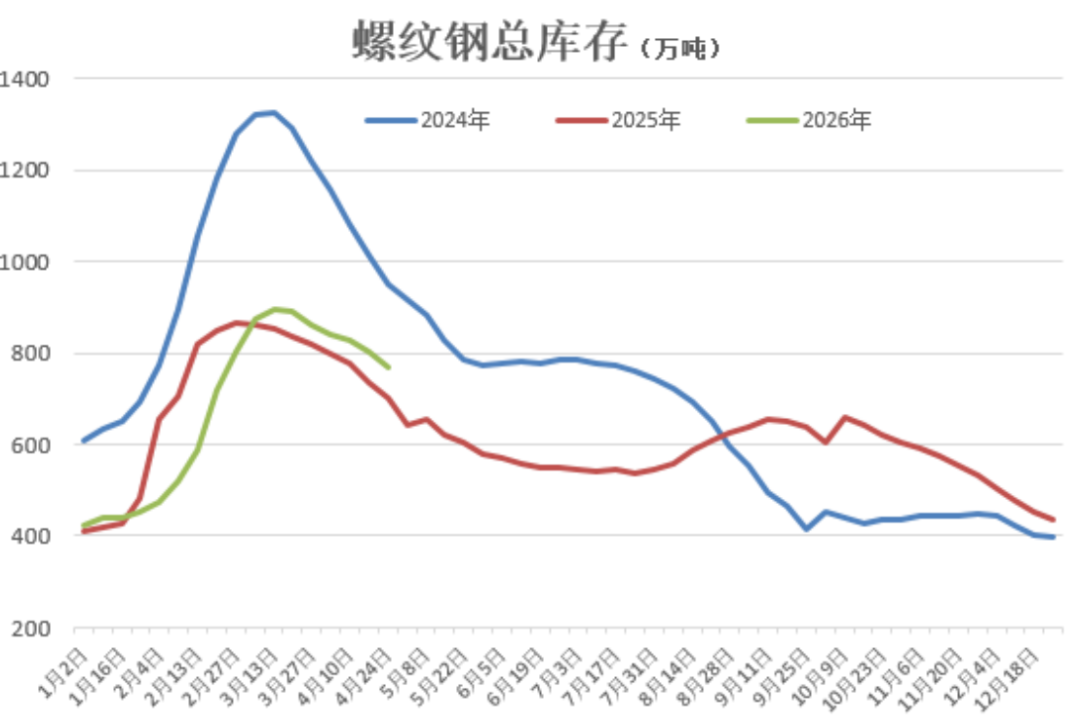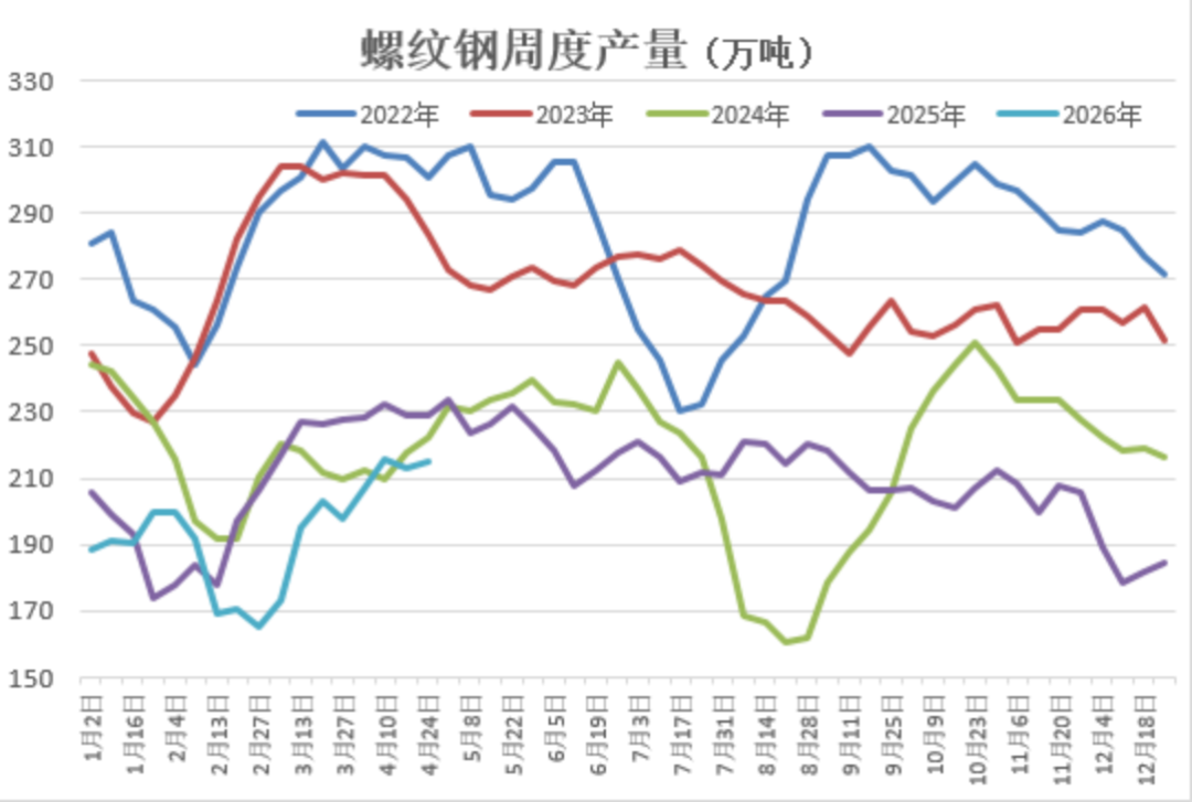 我们从2026年一季度的地产数据分析,房地产市场“整体仍表现低迷”,市场信心不足,建筑钢材周度产量虽有增加,但幅度不大。据Mysteel统计显示,截止2026年4月23日,螺纹钢周度产量普遍维持在220万吨下方,产能利用率均值则处在45%下方。
