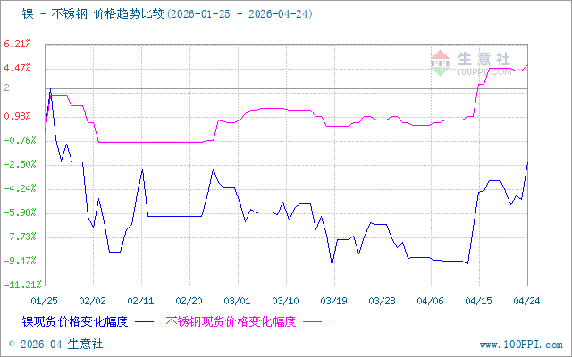 据生意社价差分析工具显示,镍和不锈钢价格走势相似,近期不锈钢和镍价都上涨。
