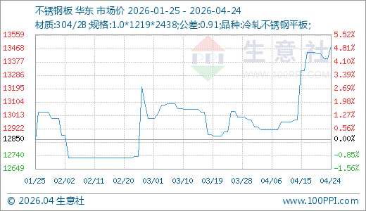 据生意社价格监测,本周不锈钢价格小幅上涨。截止4月24日,现货304/2B不锈钢平板1.0*1219*2438(公差0.91)的日均价为现报价13483.33元/吨,较周初上涨0.37%,同比上涨10%。