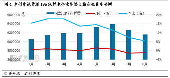 官方数据显示,7月份国家能繁母猪存栏量为4042万头,环比减少1万头,较5月份持平。卓创资讯数据显示,截止到8月底,196家样本企业能繁母猪存栏量为915.91万头,已连续两月环比减少,但幅度有限。综合国家数据与卓创资讯样本数据来看,养殖企业已开始产能去化,但幅度有限。