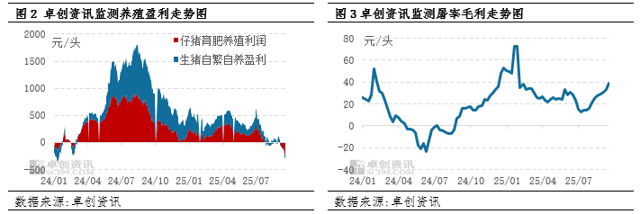 规模养殖集中度、全国产能提升以来,养殖企业和屠宰企业的盈利进入了“两难全”的境地。2024年年中以来,生猪养殖端产能释放,养殖盈利一路下滑;2025年二季度生猪供应进一步增加,养殖盈利由正转负。9月22日,卓创资讯监测生猪自繁自养盈利为-222.01元/头,仔猪育肥盈利为-82.76元/头。同时在养殖端溢价能力较强的情况下,屠宰企业收益不甚乐观,多是时候是在猪价下滑时收益才得以提升,9月19日卓创资讯监测屠宰企业屠宰毛利为39.04元/头,已是年内较高水平。