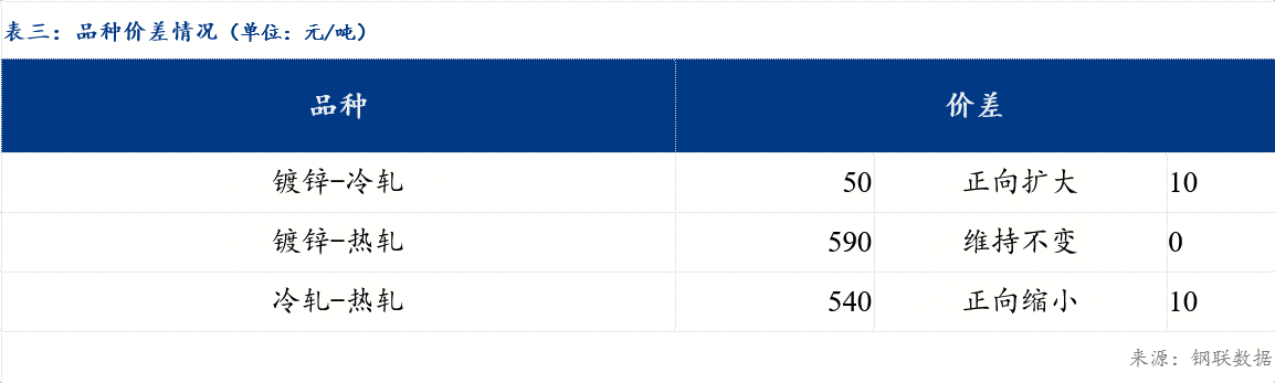 品种价差来看,现镀冷价差为50元/吨,较上一交易日正向扩大10元/吨;镀热价差为590元/吨,较上一交易日维持不变;冷热价差为540元/吨,较上一交易日正向缩小20元/吨。