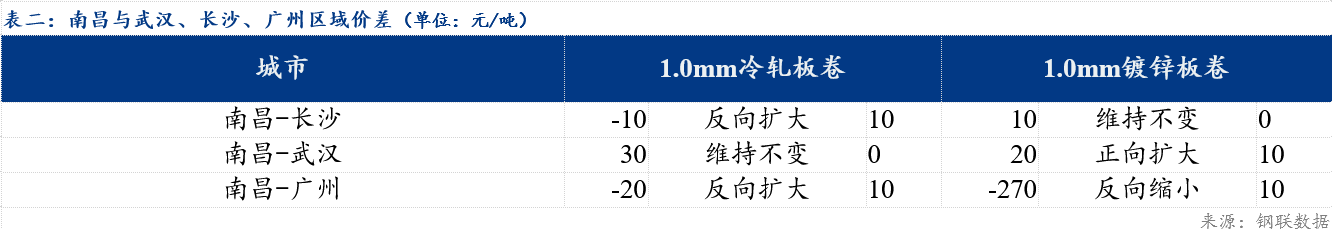 区域价差来看,冷轧品种,南昌-长沙现价差为-10元/吨,较上一交易日反向扩大10元/吨;南昌-武汉现价差为30元/吨,较上一交易日维持不变;南昌-广州现价差-20元/吨,较上一交易日反向扩大10元/吨。镀锌品种,南昌-长沙现价差10元/吨,较上一交易日维持不变;南昌-武汉现价差为20元/吨,较上一交易日正向扩大10元/吨;南昌-广州现价差为-270元/吨,较上一交易日反向缩小10元/吨。