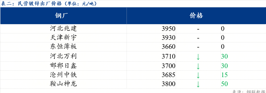 今日北方民营钢厂镀锌出厂指导价在3660-3950元/吨。