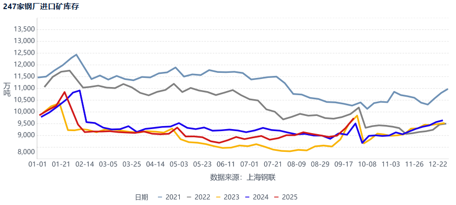 3.库存端,当前铁矿整体供需基本保持平衡状态,铁矿库存总体维持低位稳定状态,整体库存压力相对较小。