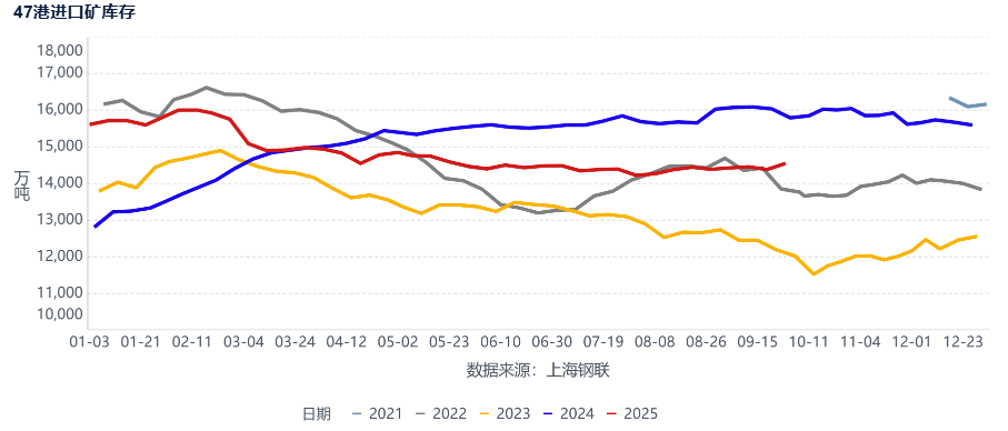 当前,铁矿整体供需基本保持平衡,库存基本保持稳定,略有回升,维持在低位水平。根据上海钢联的调研数据,目前47港铁矿石库存14551万吨,环比8月底增长163万吨,同比下降1241万吨。钢厂进口矿库存9736万吨,环比8月底增长730万吨,同比增227万吨。