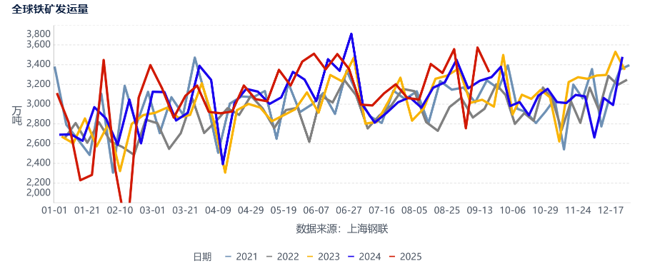 供应方面,9月份以来海外矿山发运量大幅波动,铁矿供应边际趋于改善,整体供应保持缓慢增长态势。根据上海钢联调研数据:9月份全球铁矿周度发运量均值为3337万吨,同比增37万吨,增幅1.1%。随着海外矿山新增产能的逐步投放,铁矿供应增长预期也随之而逐步增强。