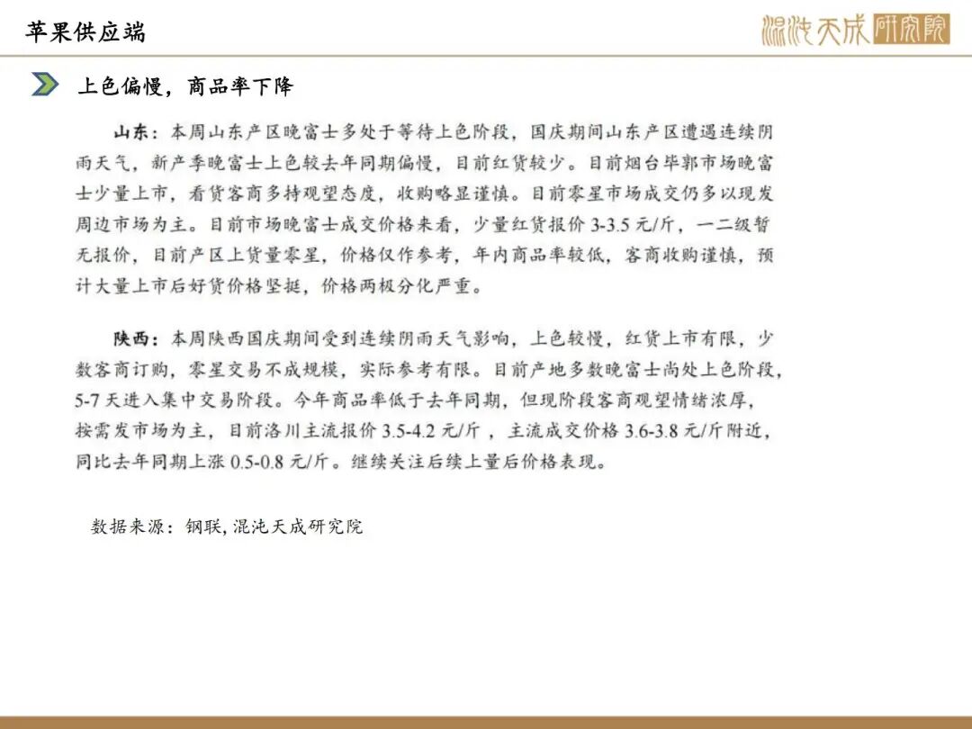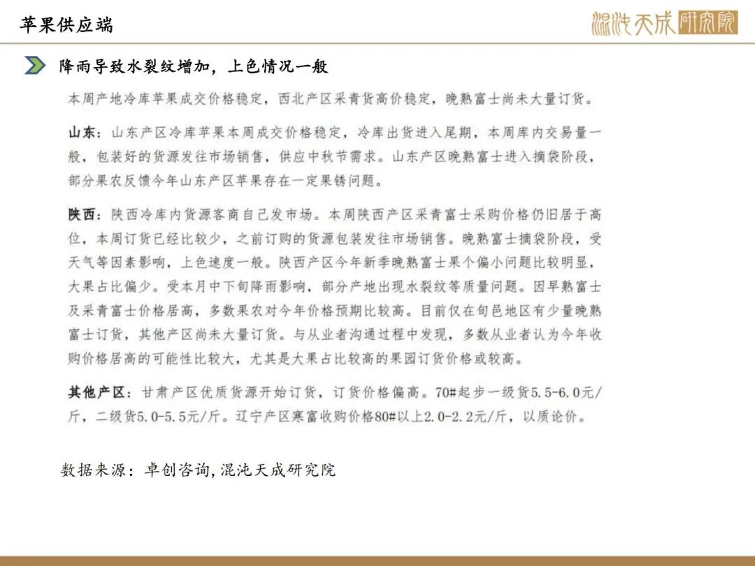 总体来看,今年晚熟苹果个头偏小,同时遭遇极端降水天气,果锈、水裂纹、黑红点等质量问题逐步发酵,利多因素仍未反应完全,大量入库前维持偏强,关注收购价格波动。