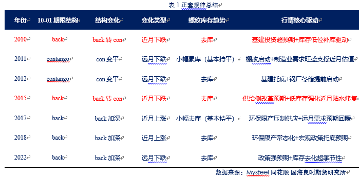 通过对过去16年数据的梳理,我们发现有7个特殊年份却走出了显著的正套行情,这些年份分别是2010年、2011年、2012年、2015年、2017年、2018年和2022年,除2010和2015年,其余反常年份都遵循一个共同模式:政策预期强化 库存结构优化(低库存/去库顺畅) back加深/contango变平 → 10-01月差正套。深入分析这些异常年份的共同特征和形成机制,有助于我们更全面地理解螺纹钢月差变动的内在规律和特殊情境下的市场逻辑。