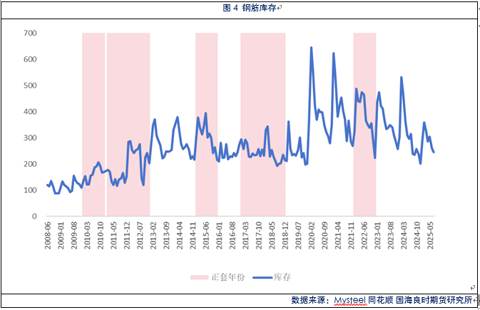首先,高库存压力是近月合约承压的核心因素。二、三季度作为传统建筑旺季向淡季过渡的关键阶段,螺纹钢库存变化往往成为主导月差结构的核心变量。春节后工地集中复工带来的需求增量通常在三月底至四月初被市场完全消化,随后进入五月份,南方梅雨季节来临,北方高温天气增多,建筑施工活动受到明显抑制。二、三季度处于宏观政策空窗期,春节后的政策预期已基本落实,而年末的经济工作会议尚未召开,市场缺乏强有力的政策刺激。同时,螺纹钢下游的房地产和基建项目在此期间多处于施工淡季,尤其7-8月高温多雨天气进一步抑制施工进度,需求端呈现季节性弱势。与此同时,钢厂在利润驱动下维持较高生产强度,导致库存持续累积。从历史数据看,每年6-8月螺纹钢社会库存平均累积幅度达到10%-20%,这种高库存现实对现货价格构成沉重压力,进而压制近月合约(10合约)表现。