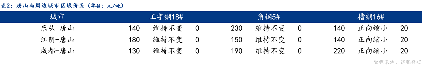 从区域价差来看,今日唐山与乐从、江阴、成都工字钢、角钢价差维持不变,与槽钢价差正向缩小;
