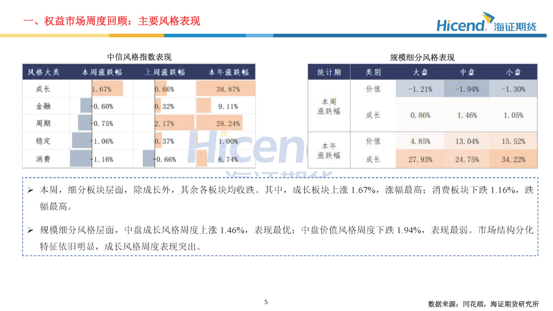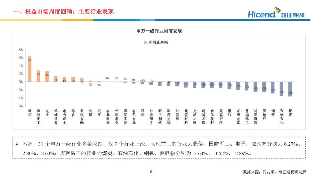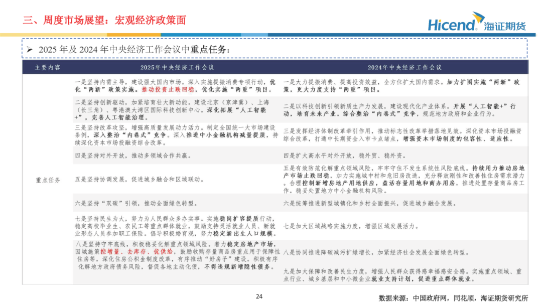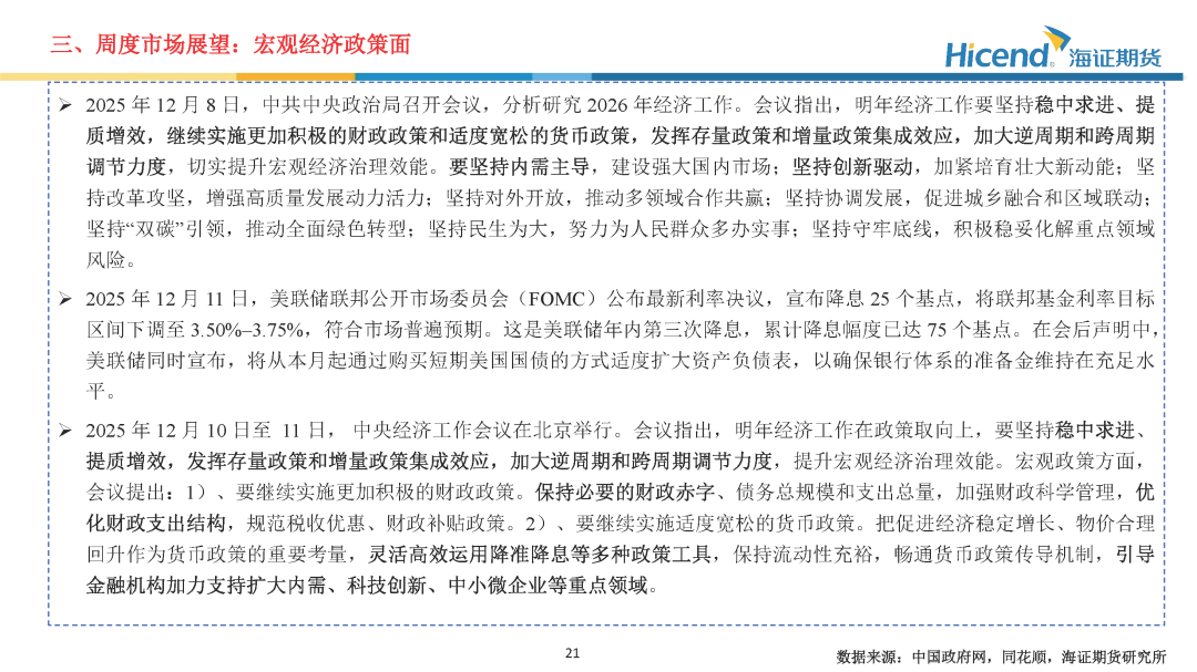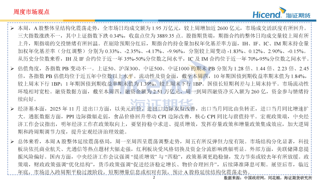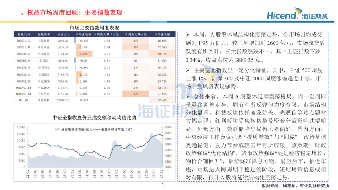 总体来看,本周A股整体延续震荡格局,周一至周四呈震荡调整走势,周五有所反弹但力度有限。市场结构分化显著,科技板块依托商业航天、光通信等热点题材大幅走强,红利板块受风格切换及资金分流影响跌幅明显。外部方面,美联储降息提振风险偏好。国内方面,中央经济工作会议强调“提质增效”与“四稳”,政策基调更趋稳健,发力节奏或较去年有所放缓。政策端,财政政策强调“优化结构”,货币政策强调“促进经济稳定增长、物价合理回升”,后续降准降息可期。展望后市,临近年底,市场进入跨周期平稳过渡阶段,短期增量信息或相对有限,预计A股将延续结构化震荡走势。