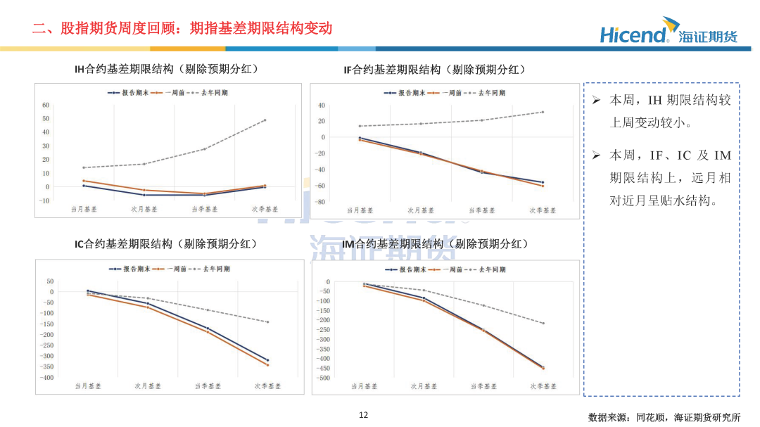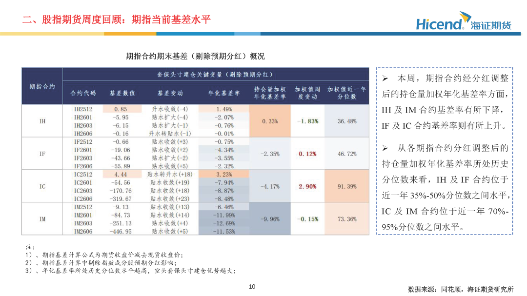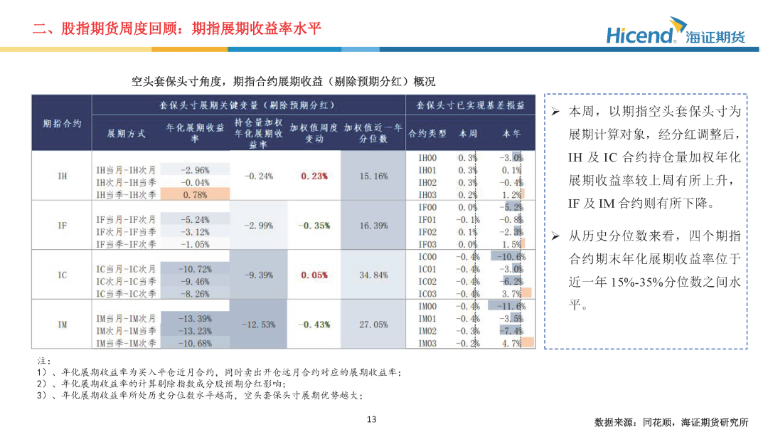 本周,A股整体呈结构化震荡走势,全市场日均成交额为1.95万亿元,较上周增加近2600亿元,市场成交活跃度有所回升。三大指数涨跌不一,其中上证指数下跌0.34%,收盘点位为3889.35点。股指期货端,期指合约的整体日均成交量较上周有所上升,期指端的交投情绪有所回温。在剔除预期分红后,期指合约持仓量加权年化基差率方面,IH、IF、IC、IM期末持仓量加权年化基差率(分红调整)分别为0.33%、-2.35%、-4.17%、-9.96%,分别较上周变动-1.83%、0.12%、2.90%、-0.15%。从历史分位数来看,IH及IF合约位于近一年35%-50%分位数之间水平,IC及IM合约位于近一年70%-95%分位数之间水平。