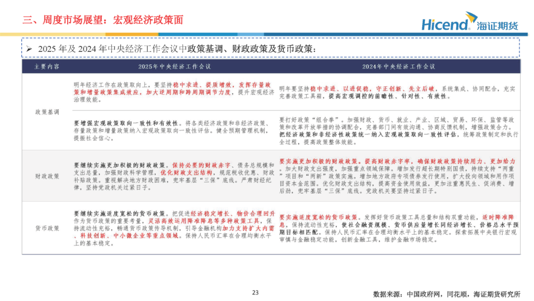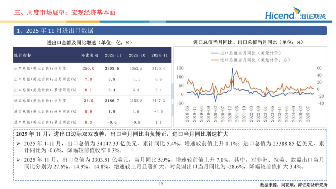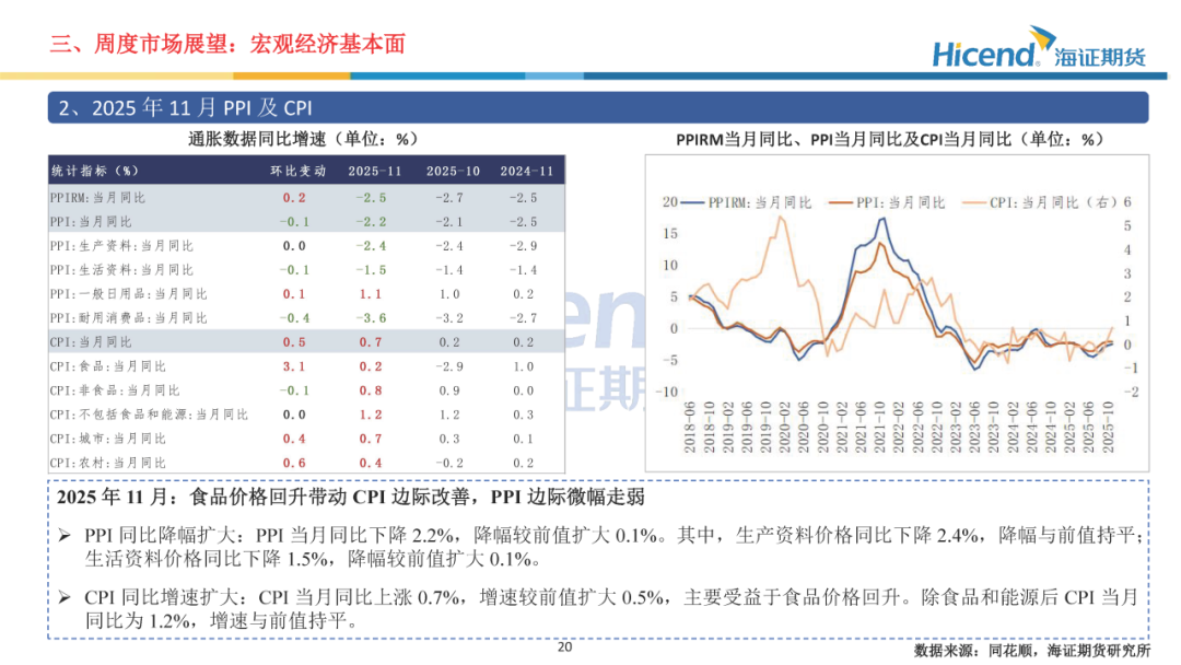 经济基本面,2025年11月进出口方面,以美元计价,进出口边际双双改善,出口当月同比由负转正,进口当月同比增速扩大。通胀数据方面,PPI边际微幅走弱,食品价格回升带动CPI边际改善,核心CPI同比与前值持平。宏观政策端,中央经济工作会议指出,明年经济工作在政策取向上,要坚持稳中求进、提质增效,发挥存量政策和增量政策集成效应,加大逆周期和跨周期调节力度,提升宏观经济治理效能。