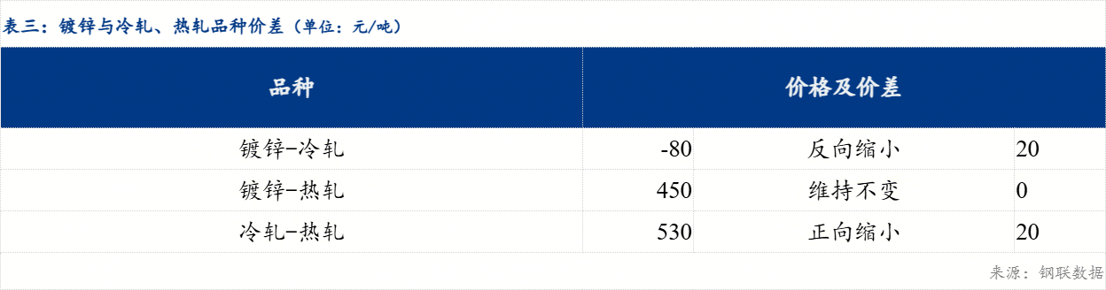 区域价差来看,天津-沈阳冷轧板卷区域价差维持不变,沈阳-哈尔滨冷轧板卷区域价差维持不变;天津-沈阳镀锌板卷区域价差维持不变,沈阳-哈尔滨镀锌板卷区域价差维持不变。品种价差来看,镀冷品种价差缩小20元/吨;镀热品种价差维持不变;冷热品种价差缩小20元/吨