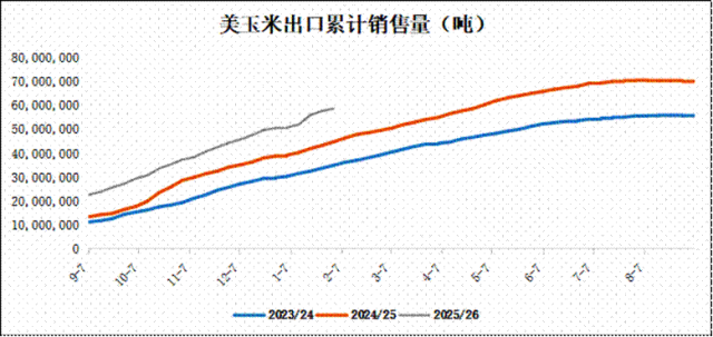 美玉米出口表现强劲,远超市场预期。截至1月29日当周,本年度美玉米累计出口销售量已达5873.5万吨,同比大幅增长1396.8万吨,创下近三年同期新高。