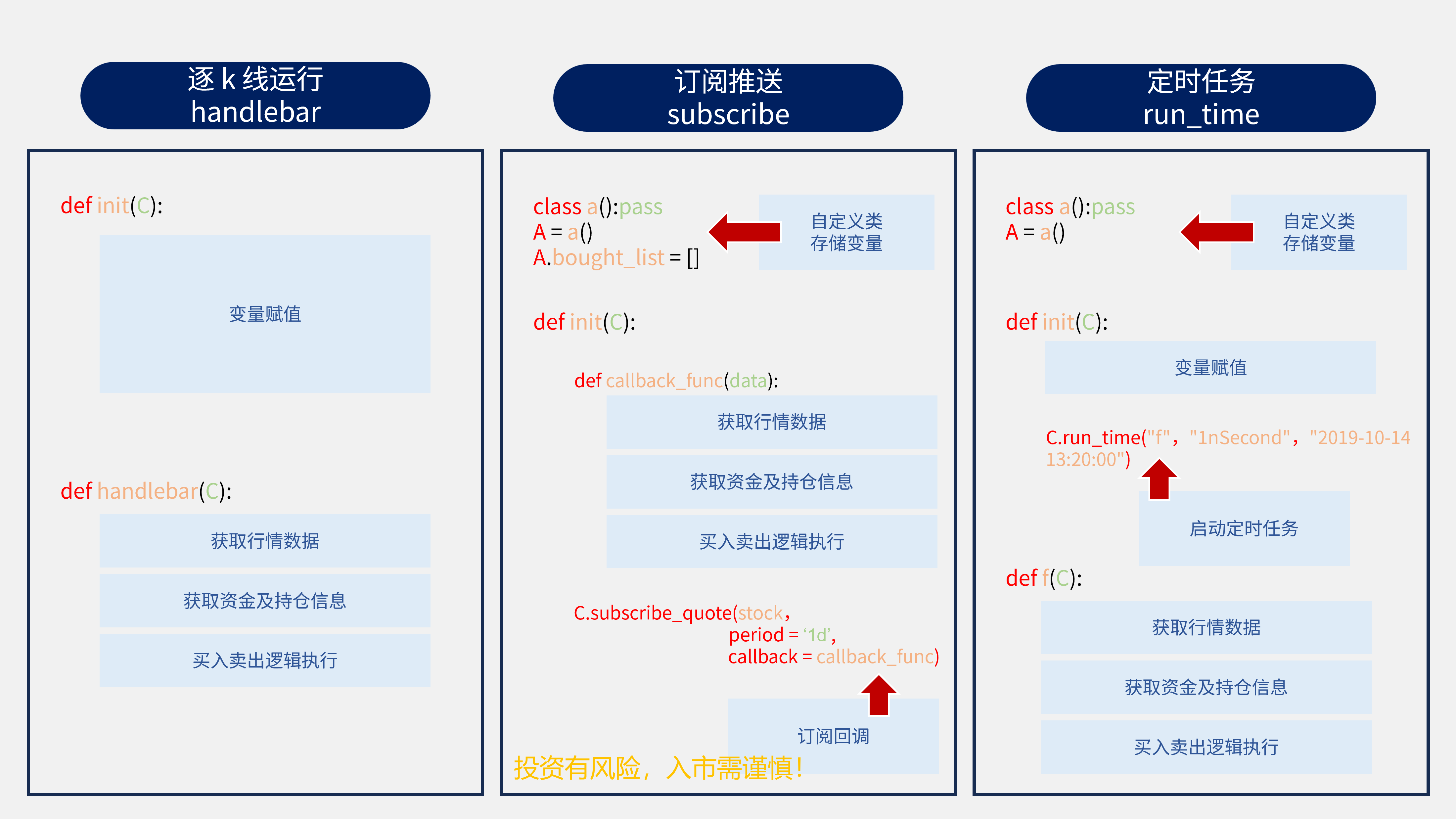 定时运行(run_time):定时任务,固定间隔触发调用,匹配盘中固定时间间隔判断交易。