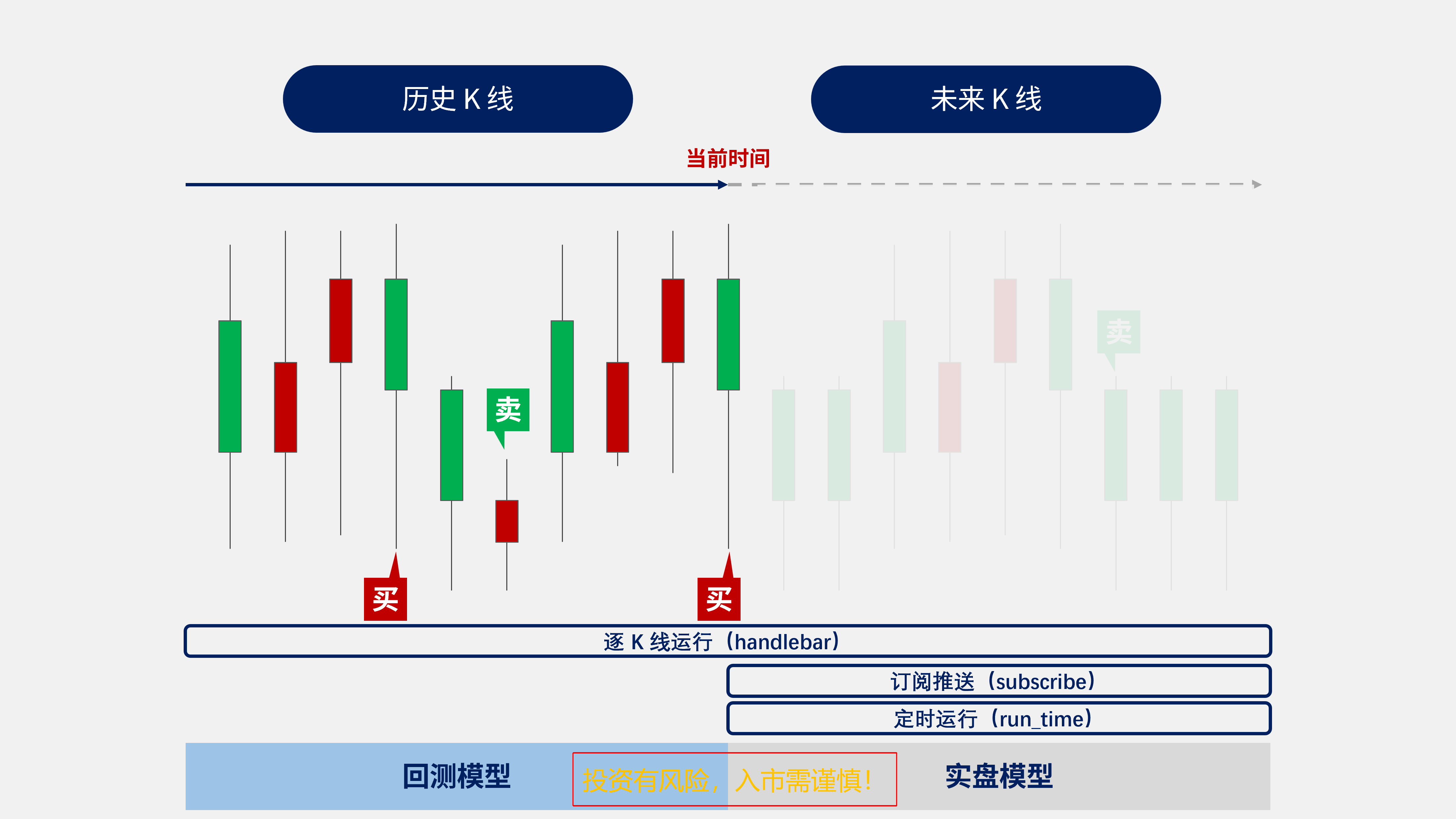 逐K线运行(handlebar):事件驱动,同时支持历史回测和盘中可模拟逐K线效果,匹配在实盘中模拟逐K线运行的效果。