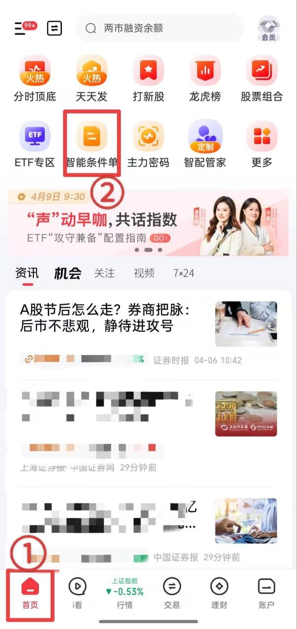 打开华泰证券涨乐财富通APP,点击底部【首页】,在页面上方的功能栏里,找到【智能条件单】,点击进入功能页面。