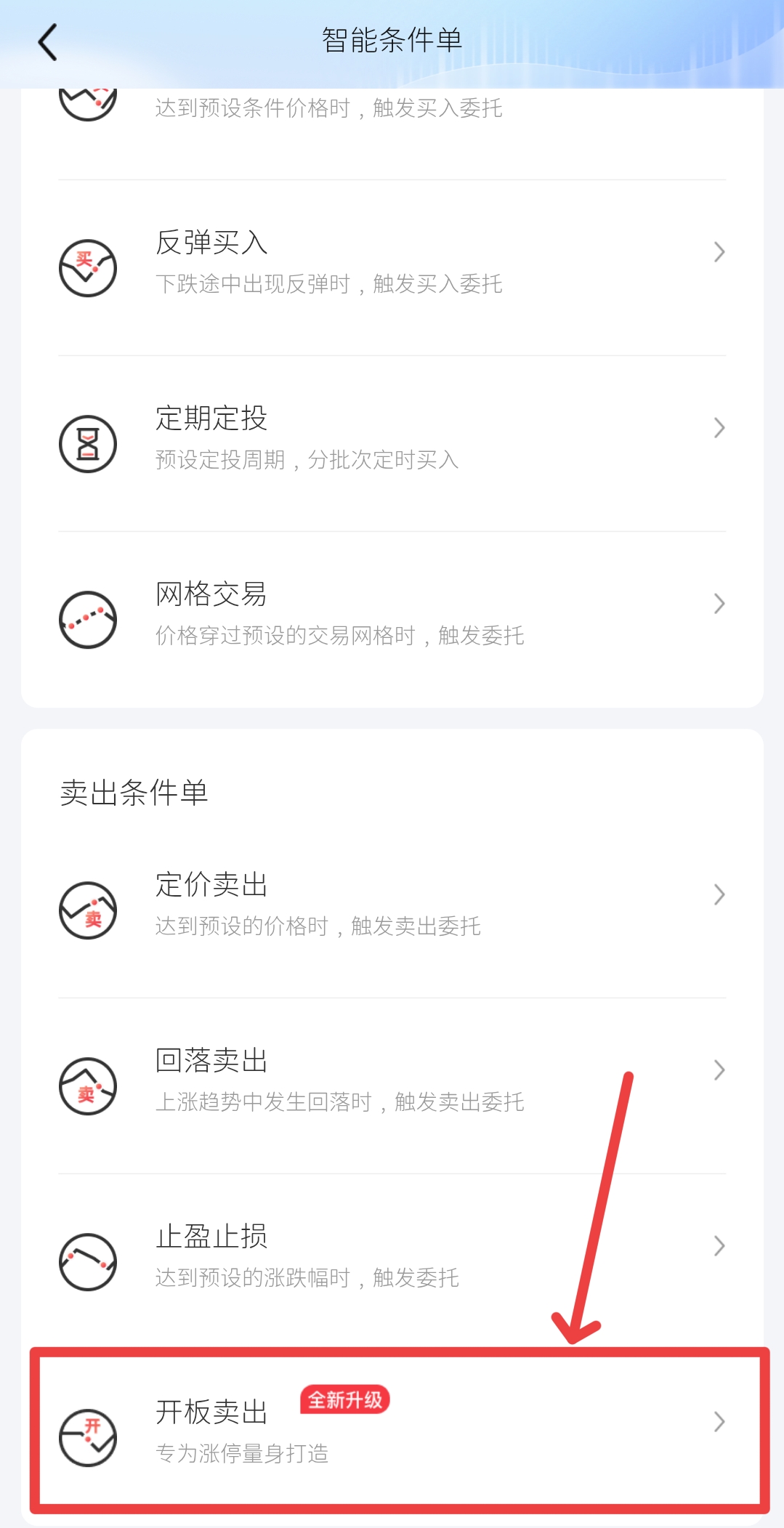 进入智能条件单页面后,下滑找到【卖出条件单】分类,就能看到【开板卖出】选项,标注了“专为涨停量身打造”,点击就能进入设置页面。