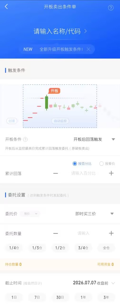 2. 选择开板触发方式:可以选【开板立即触发】,涨停开板就立刻执行卖出;也可以选【开板后回落触发】,设置累计回落的百分比(新手建议1%-3%),开板后回落到预设幅度再卖出,避免被洗盘卖飞;