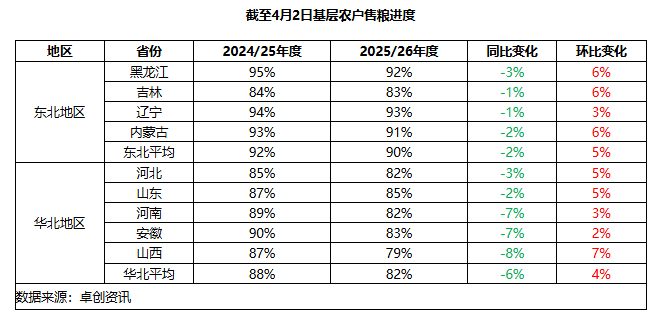截至4月2日,华北地区基层农户售粮进度在79%-85%,基层余粮较少,基层玉米购销量减少;受3月下旬以来玉米价格下跌影响,华北地区部分贸易环节对后市信心减弱,出货积极性较前期提升;同时3月中上旬玉米价格上涨较明显,贸易商春节前出库盈利空间尚可,部分贸易环节适时适量出货。因此,进入4月份以后,尽管基层玉米上量减少,但贸易商陆续适量出货,整体粮源供应仍显宽松。据卓创资讯调研了解,4月份华北地区部分贸易商仍有出货计划,预计整体粮源供应或相对稳定。
