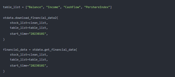 - 调用download_financial_data2和get_financial_data两个函数,拉取所需的股票财务数据;