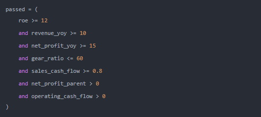 - 从Balance(资产负债表)、Income(利润表)、CashFlow(现金流量表)、PershareIndex(每股指标表)四张核心财务表中,提取最新一期的相关指标,再按照前文的筛选规则进行筛选。