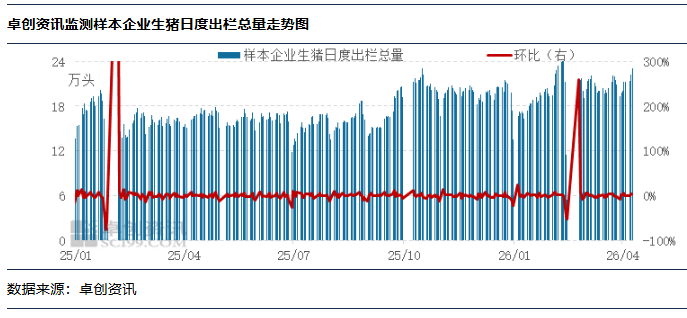 卓创资讯监测2026年4月9日样本企业生猪日度出栏总量为23.03万头,环比(较上一工作日)增幅3.85%。