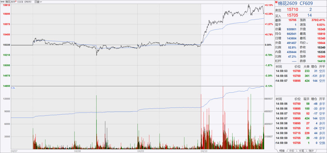 2026年4月10日当周,郑州期货交易所棉花主力合约呈现震荡上行态势。周初(4月7日)开盘价为15360元/吨,随后在4月8日跌至当周低点15,205元/吨,4月9日回升至15,340元/吨,最终在4月10日大幅上涨至15,705元/吨,前半周价格波动幅度约为200元/吨,4月10日大幅上涨,反映出市场多头力量后期发力。