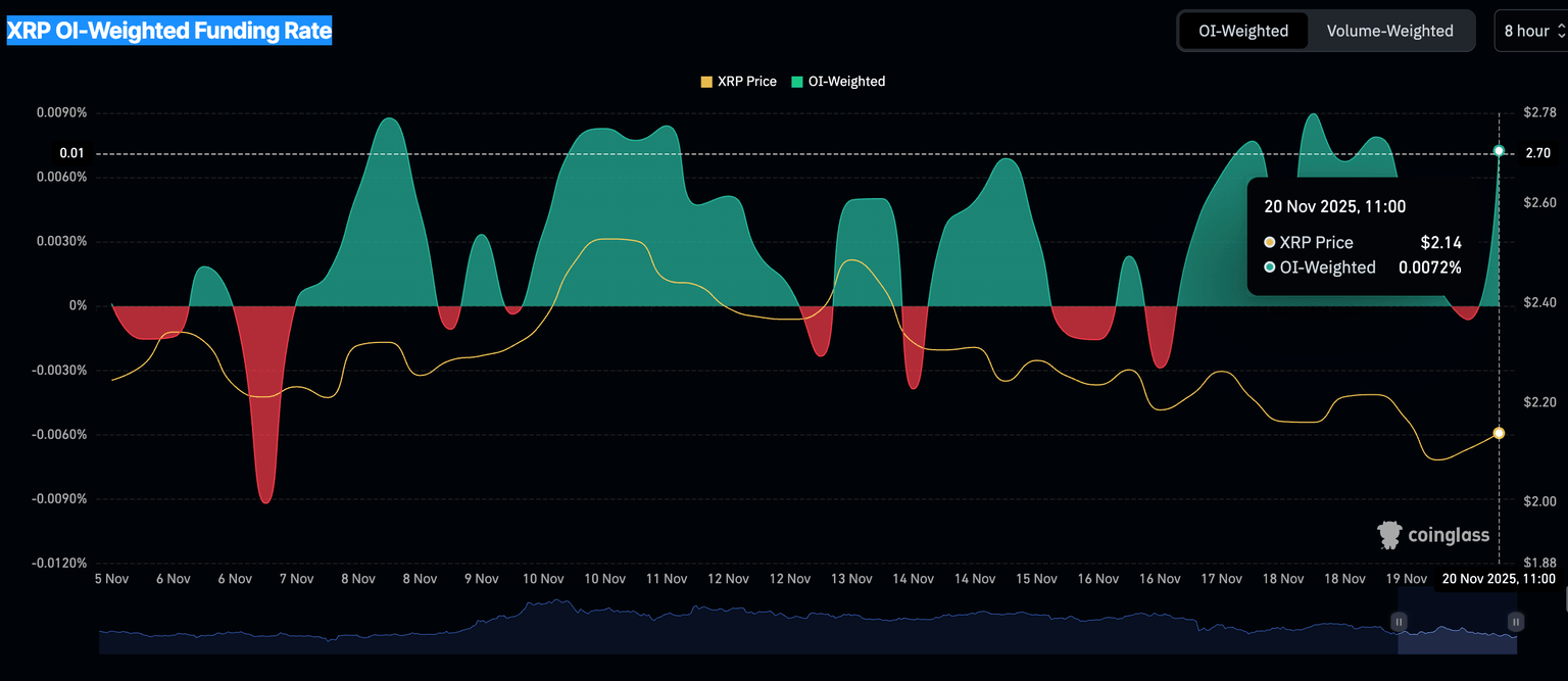 尽管整体趋势看跌,但交易者仍表现出通过买入深仓来增加持仓的意愿。周四 XRP 的未平仓合约加权资金率 (OI-Weighted Funding Rate) 为 0.0072%,高于前一日的 -0.0006%,表明交易者正在大量建立多头头寸。对 XRP 衍生品的需求必须持续增长,才能稳定该代币的短期复苏。